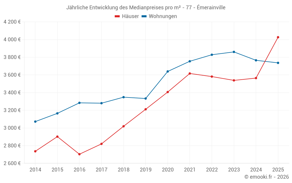 Der Durchschnittspreis auf den 39 Wohnungstransaktionen der letzten 12 Monate in der Gemeinde Émerainville betrug 3 809 € pro Quadratmeter für einen mittleren Immobilienwert von 220 000 €. Über diesen Zeitraum hinweg lagen 60% der Transaktionen zwischen 3 497 und 4 033 € pro Quadratmeter (vom 2. bis zum 8. Dezil).