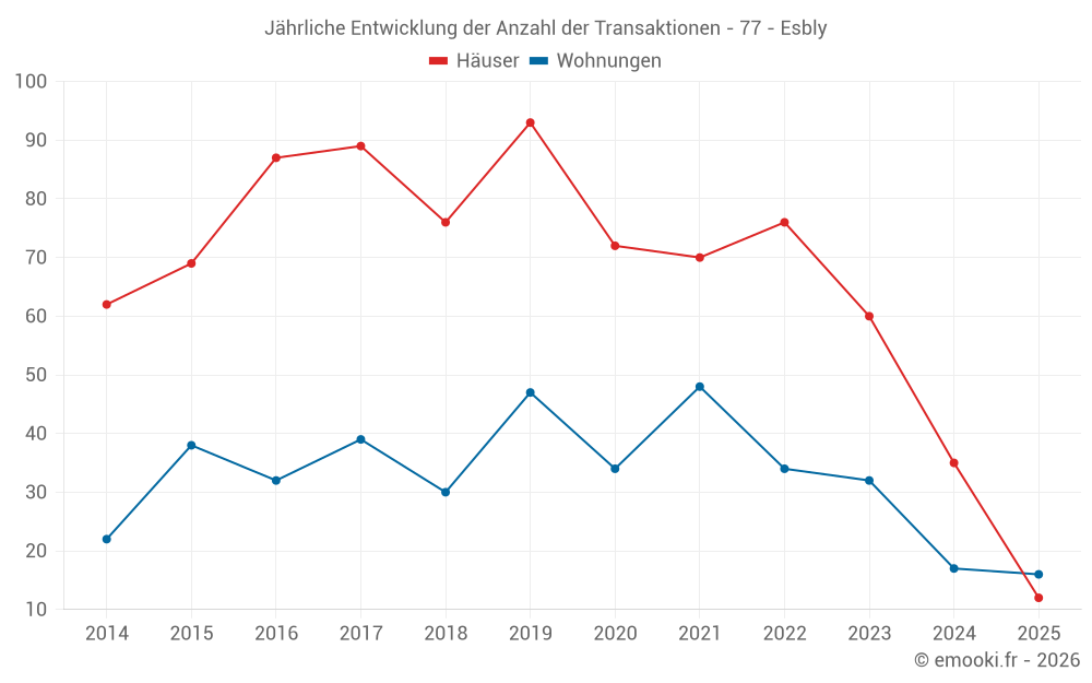 Der Durchschnittspreis auf den 32 Hausgeschäften der letzten 12 Monate in der Gemeinde Esbly betrug 3 355 € pro Quadratmeter für einen mittleren Immobilienwert von 256 500 €. Über diesen Zeitraum hinweg lagen 60% der Transaktionen zwischen 2 021 und 4 220 € pro Quadratmeter (vom 2. bis zum 8. Dezil).