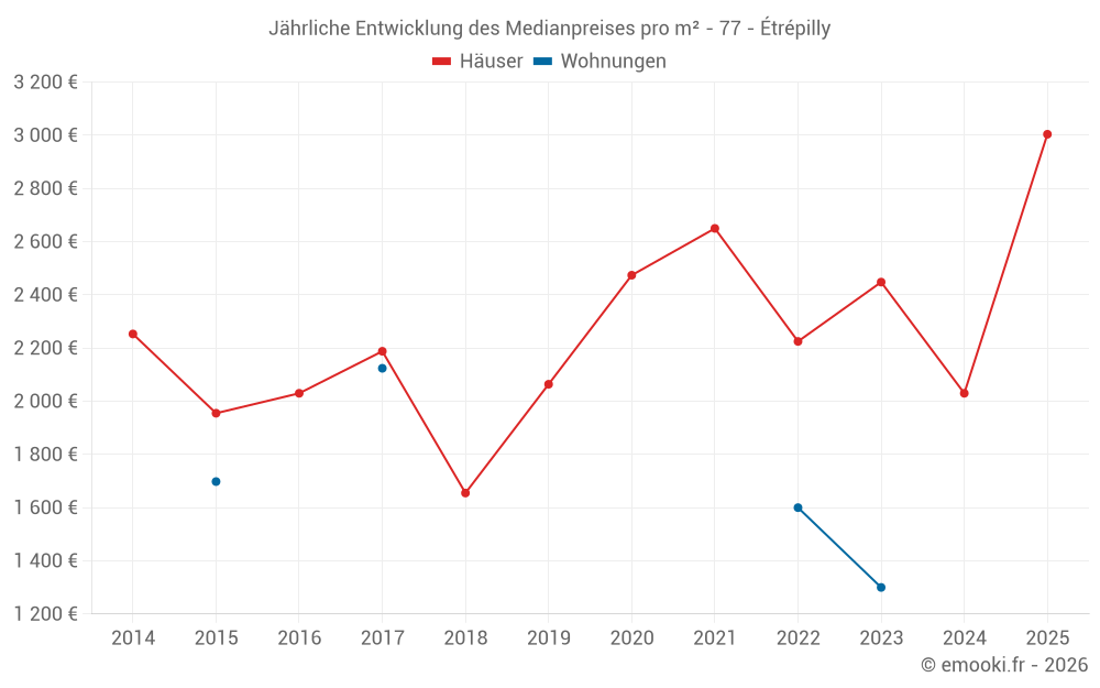Der Durchschnittspreis auf den 17 Hausgeschäften der letzten 24 Monate in der Gemeinde Étrépilly betrug 2 538 € pro Quadratmeter für einen mittleren Immobilienwert von 239 000 €. Über diesen Zeitraum hinweg lagen 60% der Transaktionen zwischen 1 800 und 3 168 € pro Quadratmeter (vom 2. bis zum 8. Dezil).