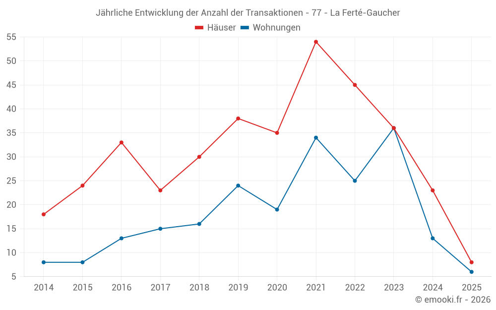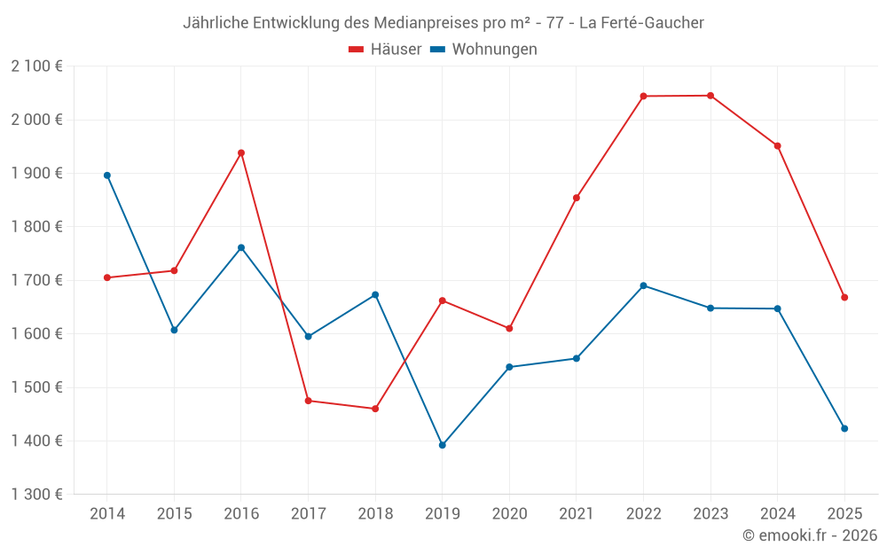 Der Durchschnittspreis auf den 34 Wohnungstransaktionen der letzten 24 Monate in der Gemeinde La Ferté-Gaucher betrug 1 650 € pro Quadratmeter für einen mittleren Immobilienwert von 77 000 €. Über diesen Zeitraum hinweg lagen 60% der Transaktionen zwischen 1 363 und 1 873 € pro Quadratmeter (vom 2. bis zum 8. Dezil).
