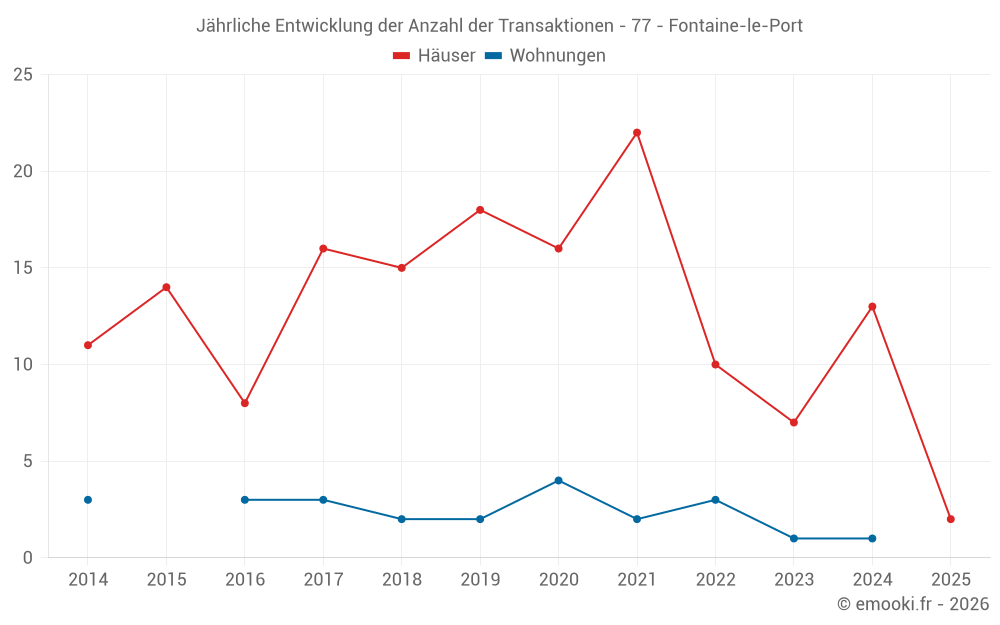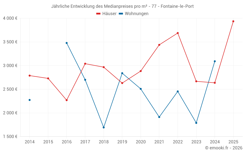 Der Durchschnittspreis auf den 19 Hausgeschäften der letzten 24 Monate in der Gemeinde Fontaine-le-Port betrug 2 636 € pro Quadratmeter für einen mittleren Immobilienwert von 252 000 €. Über diesen Zeitraum hinweg lagen 60% der Transaktionen zwischen 1 960 und 3 637 € pro Quadratmeter (vom 2. bis zum 8. Dezil).