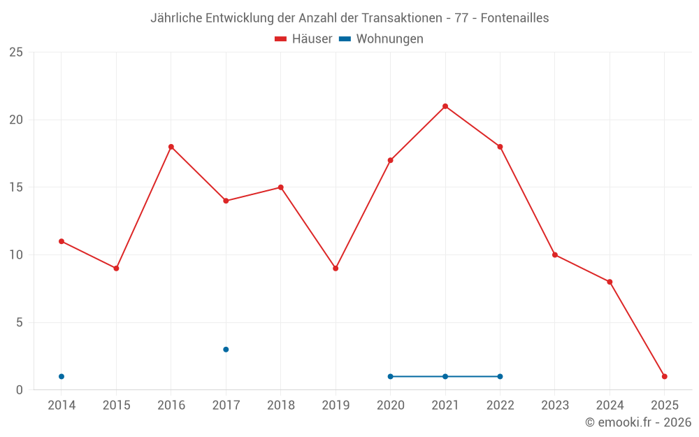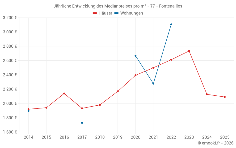 Der Durchschnittspreis auf den 17 Hausgeschäften der letzten 24 Monate in der Gemeinde Fontenailles betrug 2 245 € pro Quadratmeter für einen mittleren Immobilienwert von 220 000 €. Über diesen Zeitraum hinweg lagen 60% der Transaktionen zwischen 1 608 und 2 760 € pro Quadratmeter (vom 2. bis zum 8. Dezil).