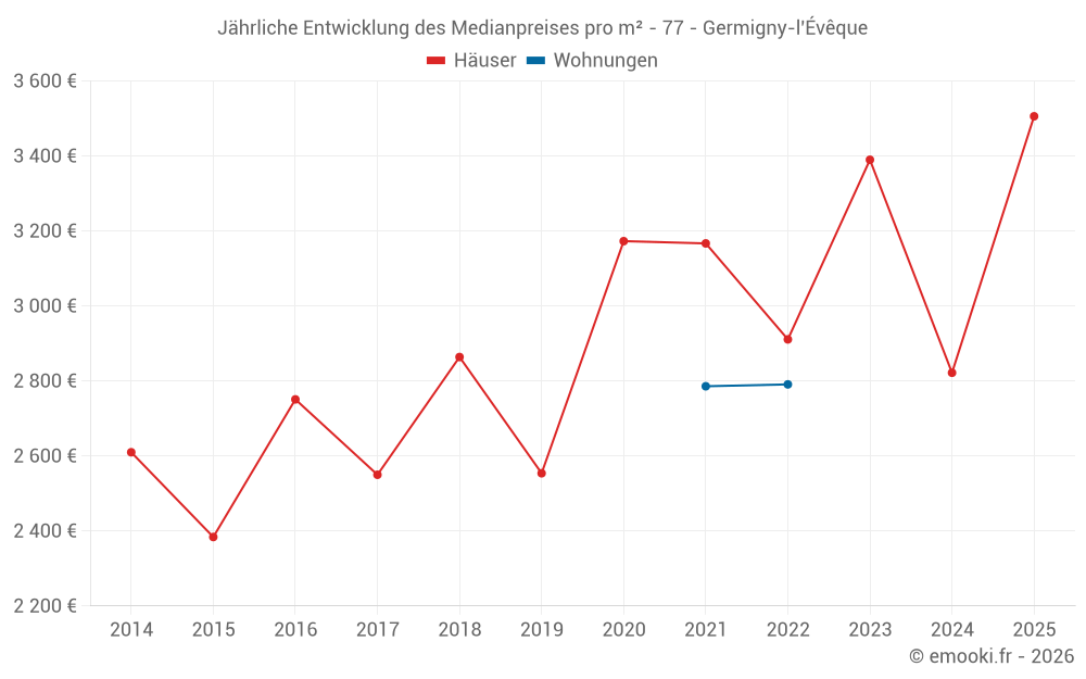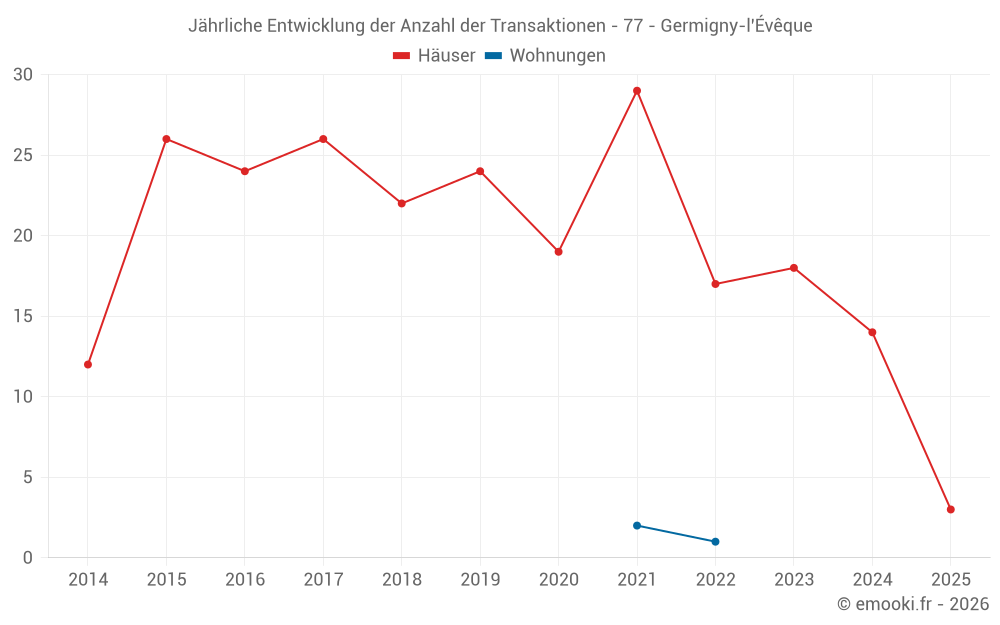 Der Durchschnittspreis auf den 25 Hausgeschäften der letzten 24 Monate in der Gemeinde Germigny-l'Évêque betrug 3 255 € pro Quadratmeter für einen mittleren Immobilienwert von 351 520 €. Über diesen Zeitraum hinweg lagen 60% der Transaktionen zwischen 2 667 und 3 604 € pro Quadratmeter (vom 2. bis zum 8. Dezil).