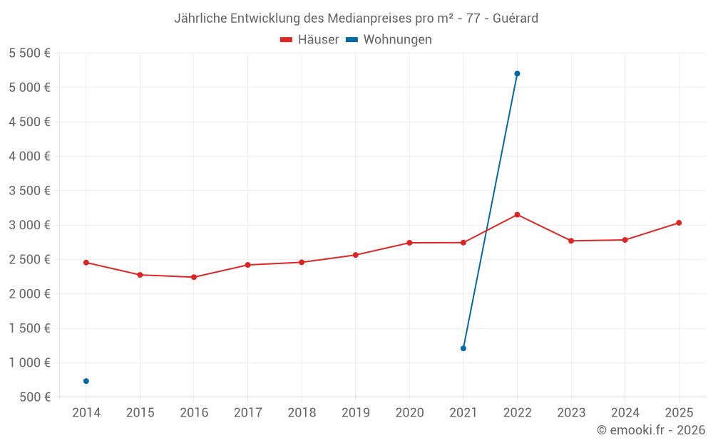 Der Durchschnittspreis auf den 27 Hausgeschäften der letzten 12 Monate in der Gemeinde Guérard betrug 2 875 € pro Quadratmeter für einen mittleren Immobilienwert von 298 000 €. Über diesen Zeitraum hinweg lagen 60% der Transaktionen zwischen 2 339 und 3 608 € pro Quadratmeter (vom 2. bis zum 8. Dezil).