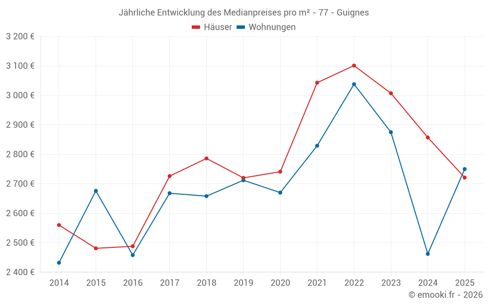Der Durchschnittspreis auf den 24 Wohnungstransaktionen der letzten 12 Monate in der Gemeinde Guignes betrug 2 812 € pro Quadratmeter für einen mittleren Immobilienwert von 183 500 €. Über diesen Zeitraum hinweg lagen 60% der Transaktionen zwischen 2 273 und 3 091 € pro Quadratmeter (vom 2. bis zum 8. Dezil).