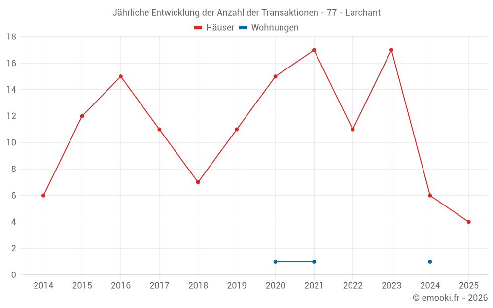 Der Durchschnittspreis auf den 15 Hausgeschäften der letzten 24 Monate in der Gemeinde Larchant betrug 2 289 € pro Quadratmeter für einen mittleren Immobilienwert von 210 000 €. Über diesen Zeitraum hinweg lagen 60% der Transaktionen zwischen 1 198 und 3 000 € pro Quadratmeter (vom 2. bis zum 8. Dezil).