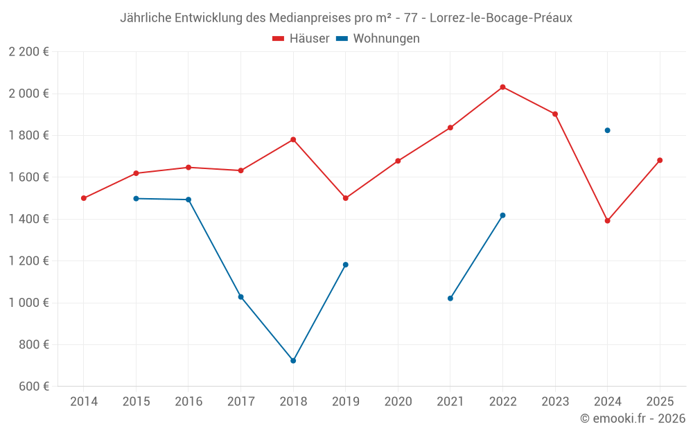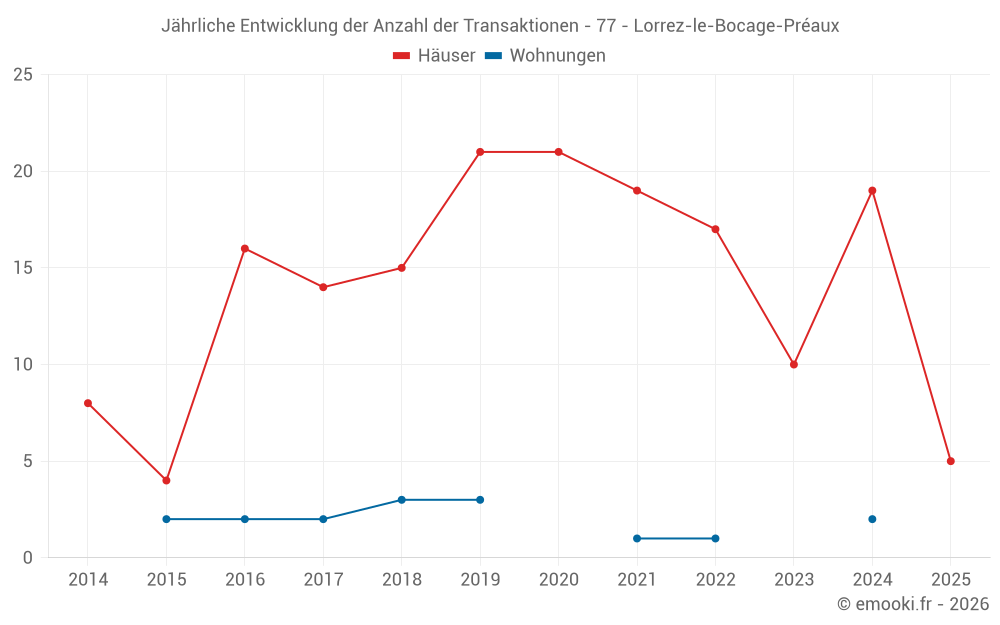 Der Durchschnittspreis auf den 28 Hausgeschäften der letzten 24 Monate in der Gemeinde Lorrez-le-Bocage-Préaux betrug 1 700 € pro Quadratmeter für einen mittleren Immobilienwert von 166 000 €. Über diesen Zeitraum hinweg lagen 60% der Transaktionen zwischen 1 123 und 2 252 € pro Quadratmeter (vom 2. bis zum 8. Dezil).