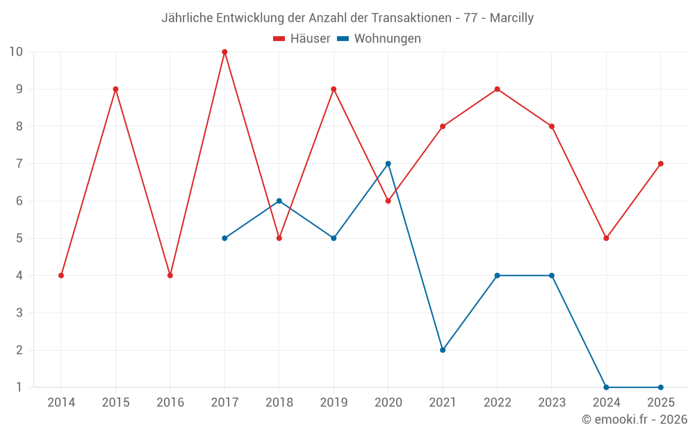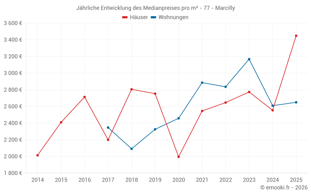 Der Durchschnittspreis auf den 15 Hausgeschäften der letzten 24 Monate in der Gemeinde Marcilly betrug 2 568 € pro Quadratmeter für einen mittleren Immobilienwert von 244 000 €. Über diesen Zeitraum hinweg lagen 60% der Transaktionen zwischen 2 404 und 3 451 € pro Quadratmeter (vom 2. bis zum 8. Dezil).