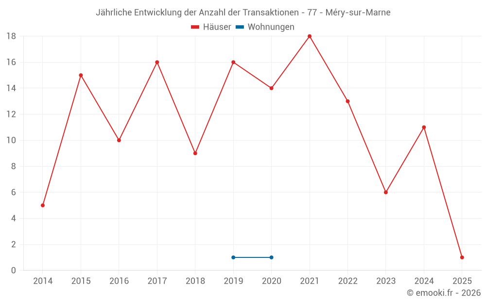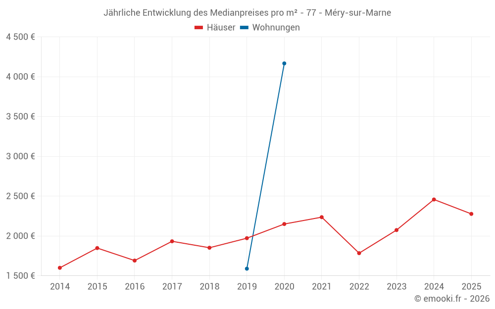 Der Durchschnittspreis auf den 17 Hausgeschäften der letzten 24 Monate in der Gemeinde Méry-sur-Marne betrug 2 344 € pro Quadratmeter für einen mittleren Immobilienwert von 118 000 €. Über diesen Zeitraum hinweg lagen 60% der Transaktionen zwischen 1 531 und 3 060 € pro Quadratmeter (vom 2. bis zum 8. Dezil).