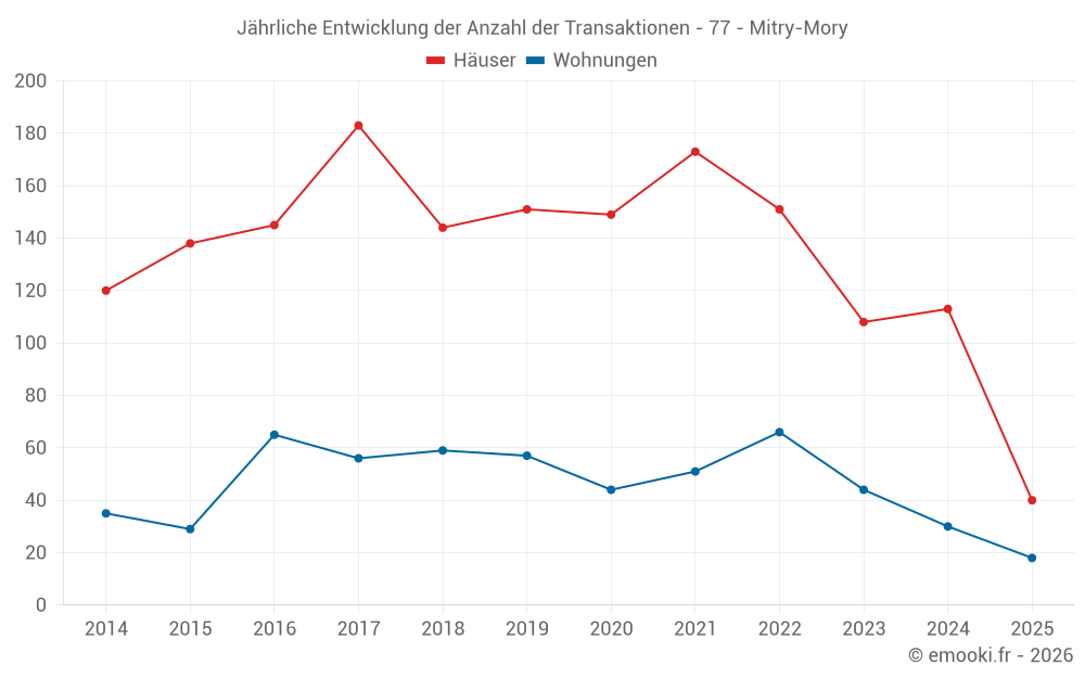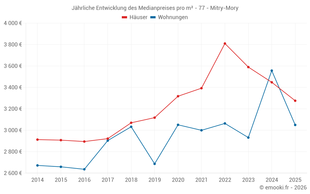 Der Durchschnittspreis auf den 40 Hausgeschäften der letzten 6 Monate in der Gemeinde Mitry-Mory betrug 3 276 € pro Quadratmeter für einen mittleren Immobilienwert von 302 500 €. Über diesen Zeitraum hinweg lagen 60% der Transaktionen zwischen 2 528 und 3 968 € pro Quadratmeter (vom 2. bis zum 8. Dezil).