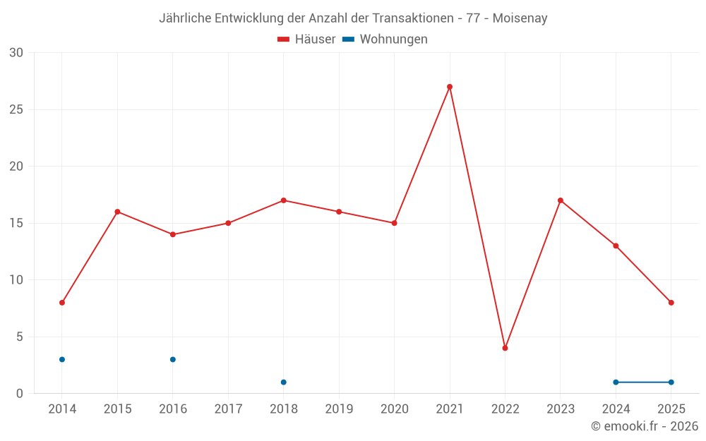 Der Durchschnittspreis auf den 27 Hausgeschäften der letzten 24 Monate in der Gemeinde Moisenay betrug 2 815 € pro Quadratmeter für einen mittleren Immobilienwert von 271 000 €. Über diesen Zeitraum hinweg lagen 60% der Transaktionen zwischen 2 256 und 3 409 € pro Quadratmeter (vom 2. bis zum 8. Dezil).