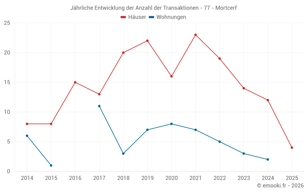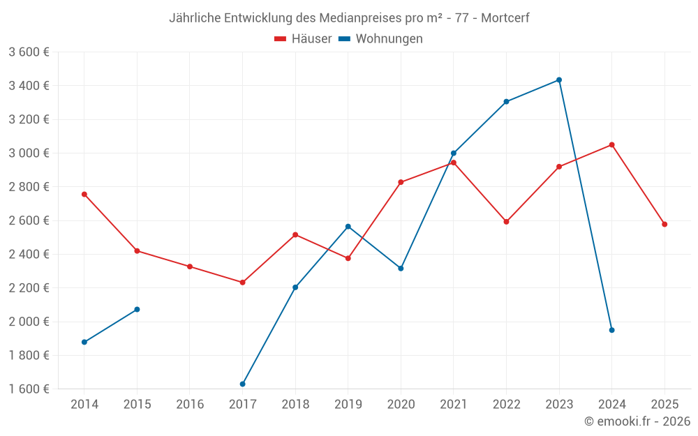 Der Durchschnittspreis auf den 22 Hausgeschäften der letzten 24 Monate in der Gemeinde Mortcerf betrug 2 977 € pro Quadratmeter für einen mittleren Immobilienwert von 311 675 €. Über diesen Zeitraum hinweg lagen 60% der Transaktionen zwischen 2 060 und 3 363 € pro Quadratmeter (vom 2. bis zum 8. Dezil).