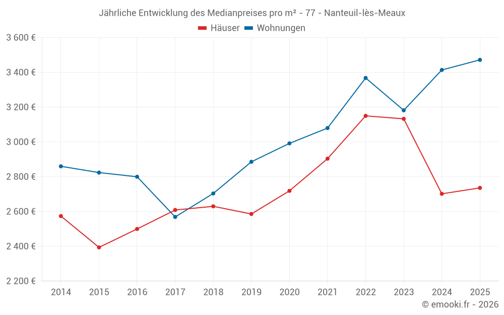 Der Durchschnittspreis auf den 24 Wohnungstransaktionen der letzten 24 Monate in der Gemeinde Nanteuil-lès-Meaux betrug 3 467 € pro Quadratmeter für einen mittleren Immobilienwert von 163 500 €. Über diesen Zeitraum hinweg lagen 60% der Transaktionen zwischen 2 248 und 3 752 € pro Quadratmeter (vom 2. bis zum 8. Dezil).