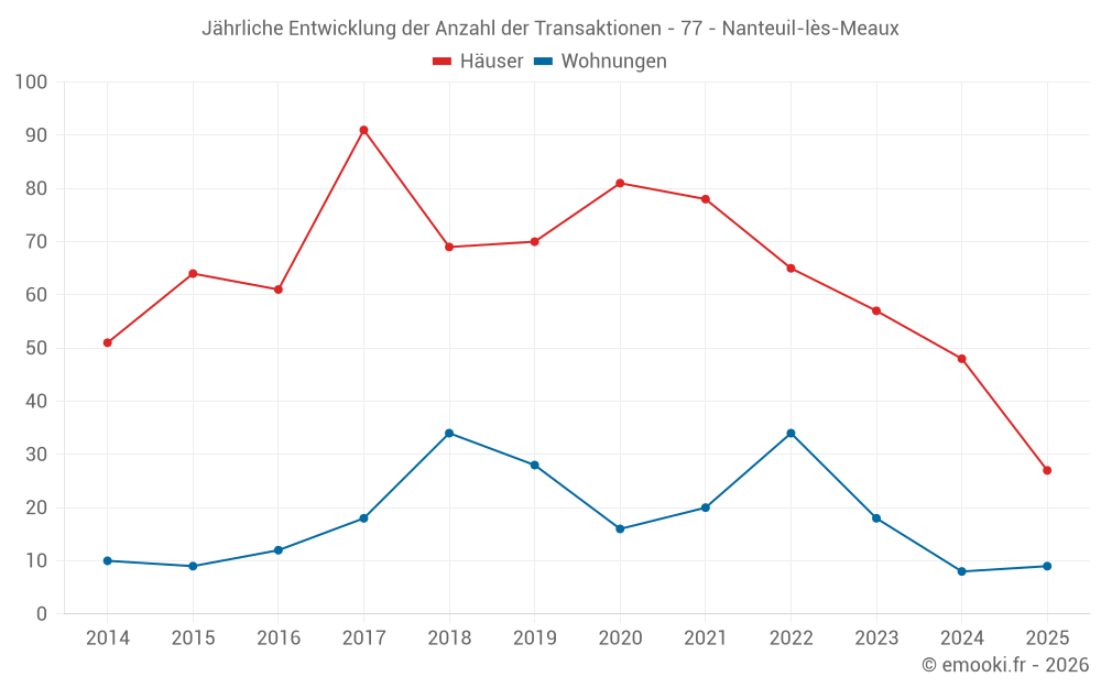 Der Durchschnittspreis auf den 27 Hausgeschäften der letzten 6 Monate in der Gemeinde Nanteuil-lès-Meaux betrug 2 736 € pro Quadratmeter für einen mittleren Immobilienwert von 261 000 €. Über diesen Zeitraum hinweg lagen 60% der Transaktionen zwischen 1 791 und 3 655 € pro Quadratmeter (vom 2. bis zum 8. Dezil).