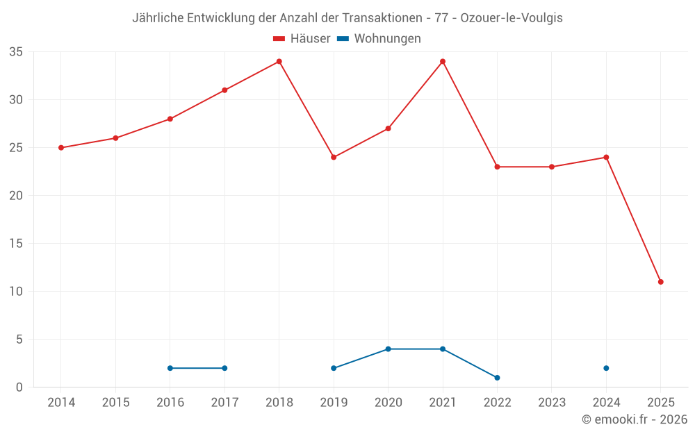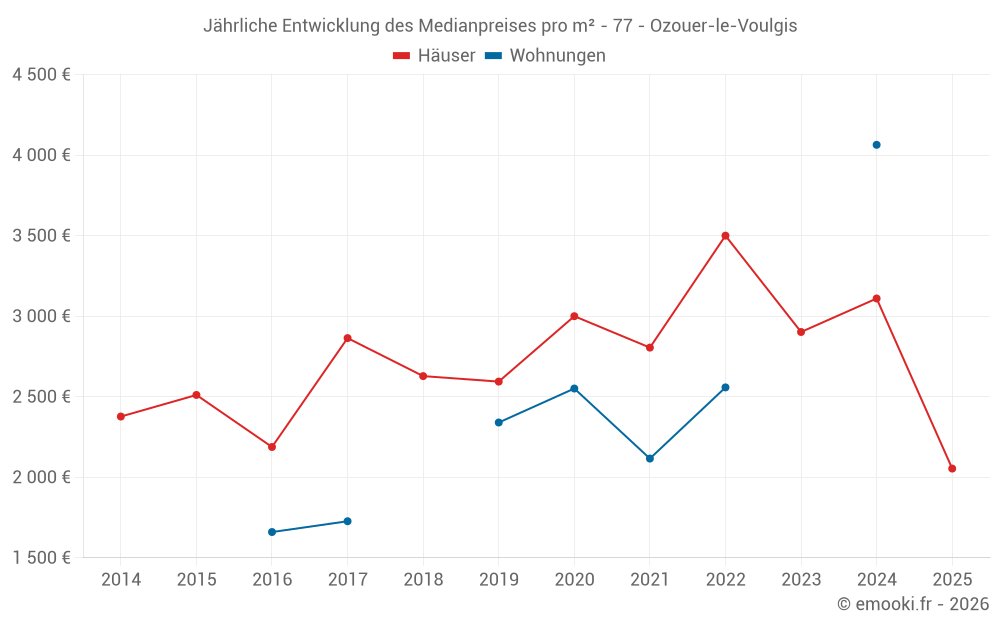 Der Durchschnittspreis auf den 28 Hausgeschäften der letzten 12 Monate in der Gemeinde Ozouer-le-Voulgis betrug 2 848 € pro Quadratmeter für einen mittleren Immobilienwert von 262 500 €. Über diesen Zeitraum hinweg lagen 60% der Transaktionen zwischen 1 827 und 3 796 € pro Quadratmeter (vom 2. bis zum 8. Dezil).