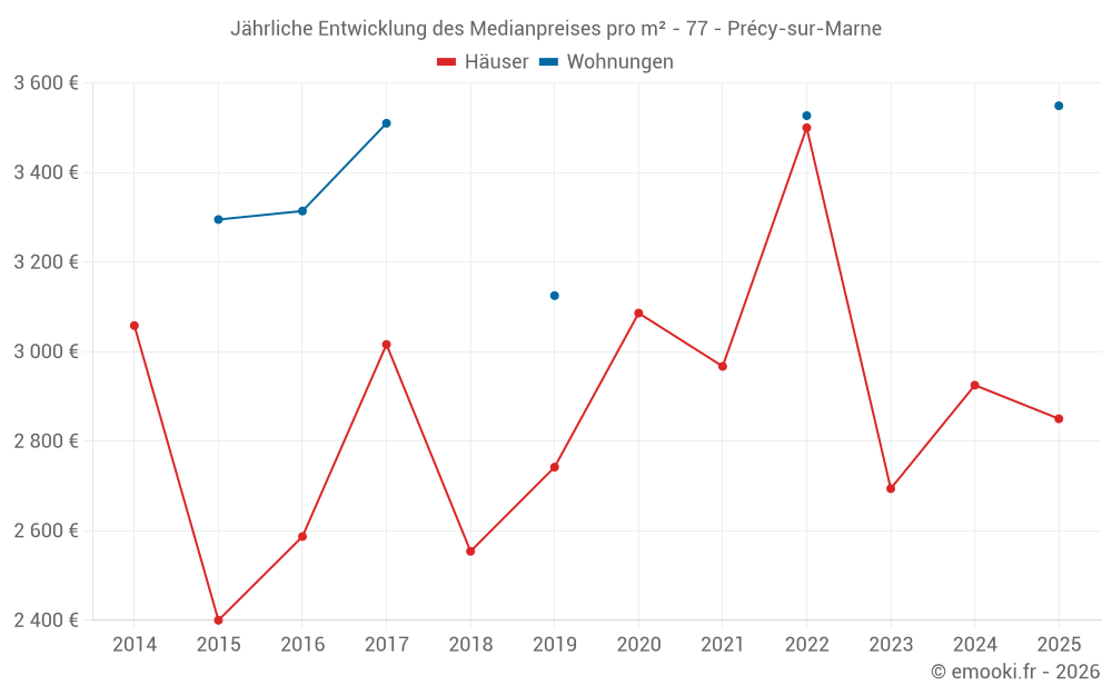 Der Durchschnittspreis auf den 14 Hausgeschäften der letzten 24 Monate in der Gemeinde Précy-sur-Marne betrug 2 896 € pro Quadratmeter für einen mittleren Immobilienwert von 285 000 €. Über diesen Zeitraum hinweg lagen 60% der Transaktionen zwischen 2 098 und 3 203 € pro Quadratmeter (vom 2. bis zum 8. Dezil).
