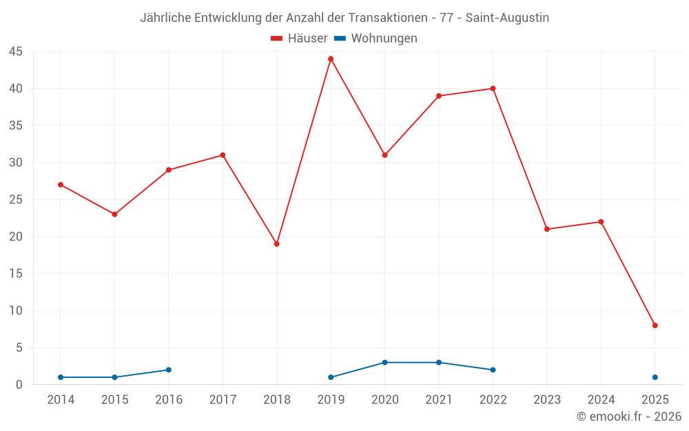 Der Durchschnittspreis auf den 23 Hausgeschäften der letzten 12 Monate in der Gemeinde Saint-Augustin betrug 2 692 € pro Quadratmeter für einen mittleren Immobilienwert von 303 500 €. Über diesen Zeitraum hinweg lagen 60% der Transaktionen zwischen 2 152 und 3 042 € pro Quadratmeter (vom 2. bis zum 8. Dezil).