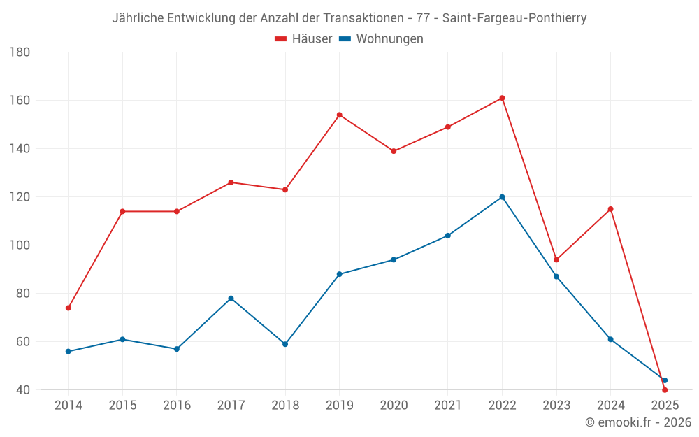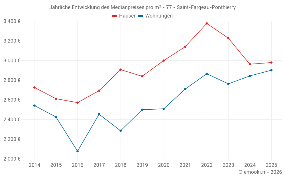 Der Durchschnittspreis auf den 44 Wohnungstransaktionen der letzten 6 Monate in der Gemeinde Saint-Fargeau-Ponthierry betrug 2 902 € pro Quadratmeter für einen mittleren Immobilienwert von 129 140 €. Über diesen Zeitraum hinweg lagen 60% der Transaktionen zwischen 2 227 und 3 364 € pro Quadratmeter (vom 2. bis zum 8. Dezil).