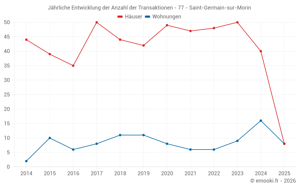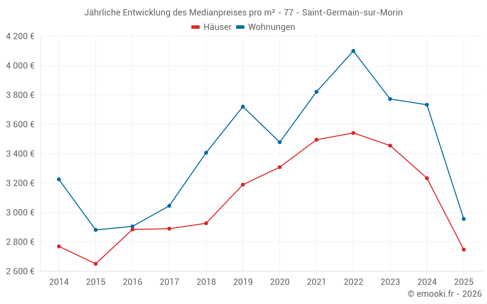 Der Durchschnittspreis auf den 28 Wohnungstransaktionen der letzten 24 Monate in der Gemeinde Saint-Germain-sur-Morin betrug 3 513 € pro Quadratmeter für einen mittleren Immobilienwert von 185 850 €. Über diesen Zeitraum hinweg lagen 60% der Transaktionen zwischen 2 866 und 4 167 € pro Quadratmeter (vom 2. bis zum 8. Dezil).