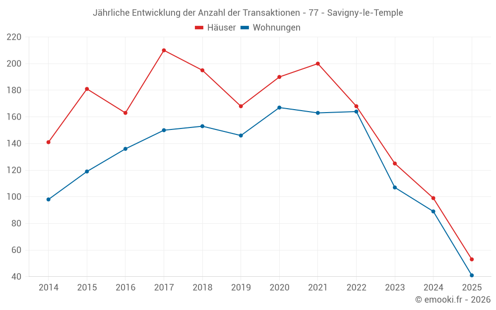 Der Durchschnittspreis auf den 53 Hausgeschäften der letzten 6 Monate in der Gemeinde Savigny-le-Temple betrug 2 756 € pro Quadratmeter für einen mittleren Immobilienwert von 265 000 €. Über diesen Zeitraum hinweg lagen 60% der Transaktionen zwischen 2 283 und 3 076 € pro Quadratmeter (vom 2. bis zum 8. Dezil).