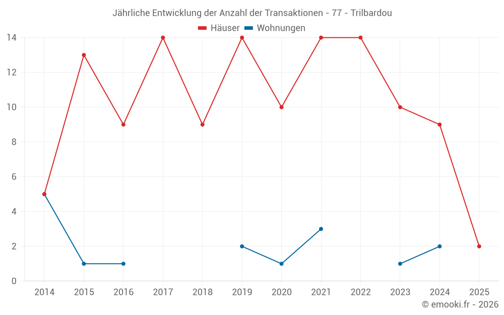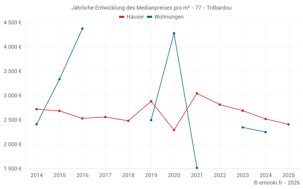 Der Durchschnittspreis auf den 17 Hausgeschäften der letzten 24 Monate in der Gemeinde Trilbardou betrug 2 444 € pro Quadratmeter für einen mittleren Immobilienwert von 213 000 €. Über diesen Zeitraum hinweg lagen 60% der Transaktionen zwischen 1 198 und 3 003 € pro Quadratmeter (vom 2. bis zum 8. Dezil).