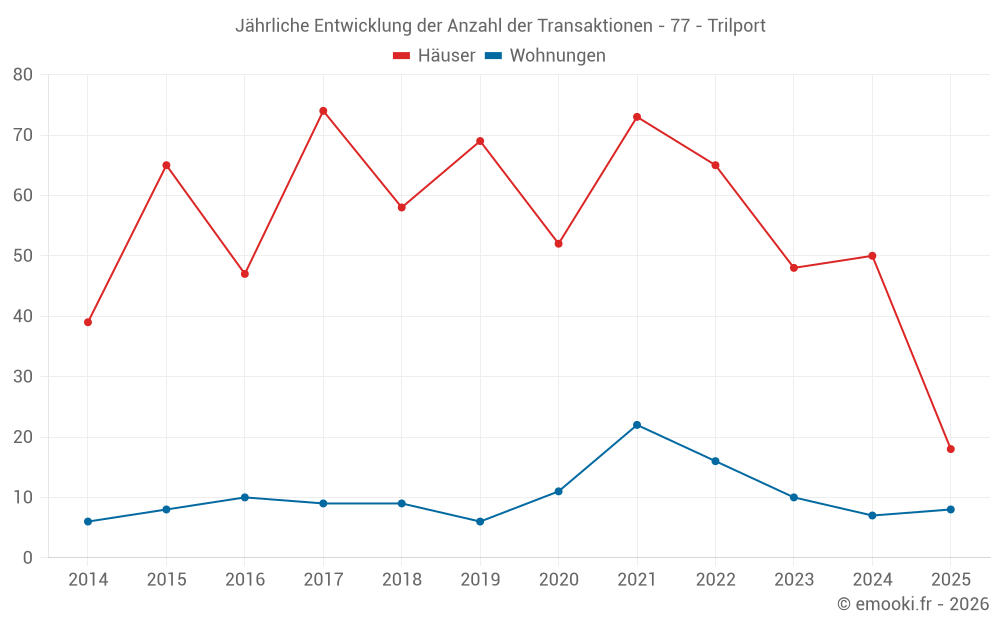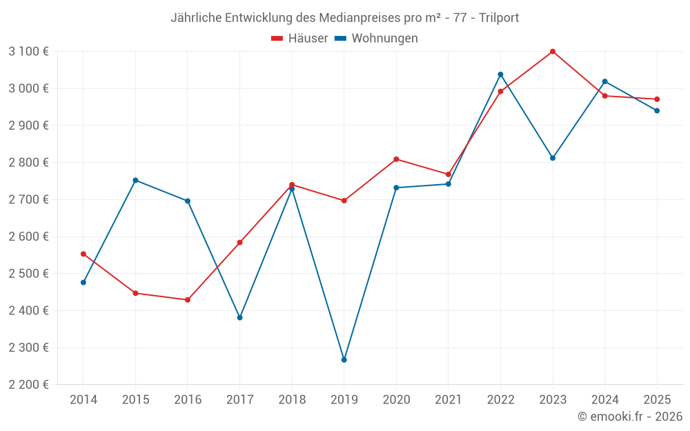 Der Durchschnittspreis auf den 19 Wohnungstransaktionen der letzten 24 Monate in der Gemeinde Trilport betrug 2 871 € pro Quadratmeter für einen mittleren Immobilienwert von 142 000 €. Über diesen Zeitraum hinweg lagen 60% der Transaktionen zwischen 2 388 und 3 329 € pro Quadratmeter (vom 2. bis zum 8. Dezil).