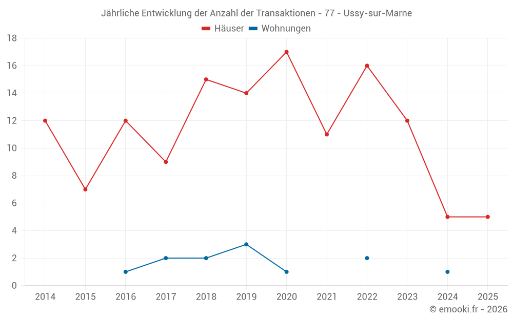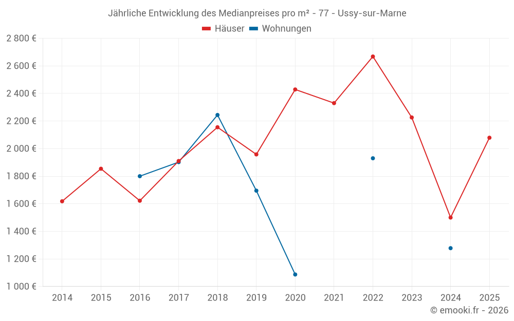 Der Durchschnittspreis auf den 15 Hausgeschäften der letzten 24 Monate in der Gemeinde Ussy-sur-Marne betrug 2 079 € pro Quadratmeter für einen mittleren Immobilienwert von 210 000 €. Über diesen Zeitraum hinweg lagen 60% der Transaktionen zwischen 1 403 und 2 463 € pro Quadratmeter (vom 2. bis zum 8. Dezil).