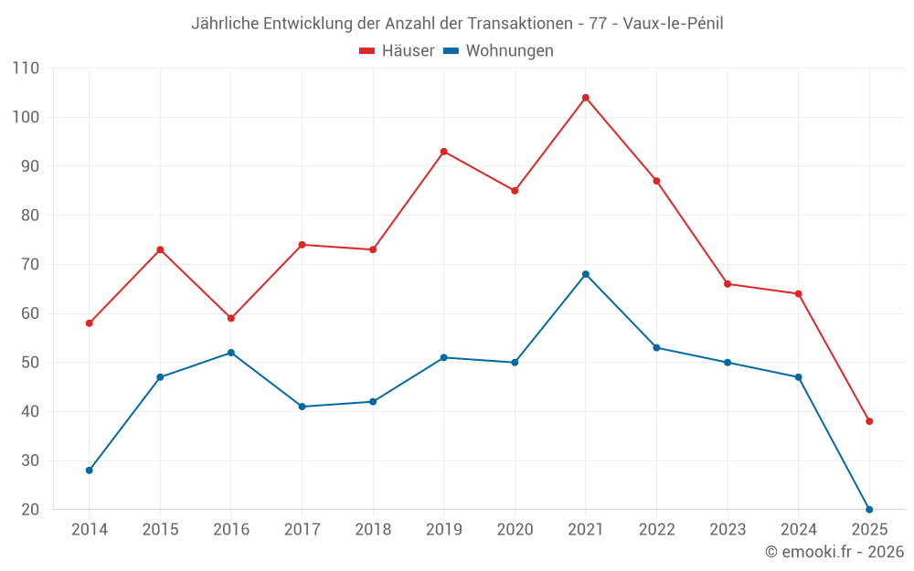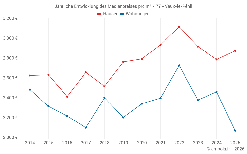 Der Durchschnittspreis auf den 38 Hausgeschäften der letzten 6 Monate in der Gemeinde Vaux-le-Pénil betrug 2 873 € pro Quadratmeter für einen mittleren Immobilienwert von 289 500 €. Über diesen Zeitraum hinweg lagen 60% der Transaktionen zwischen 2 403 und 3 469 € pro Quadratmeter (vom 2. bis zum 8. Dezil).