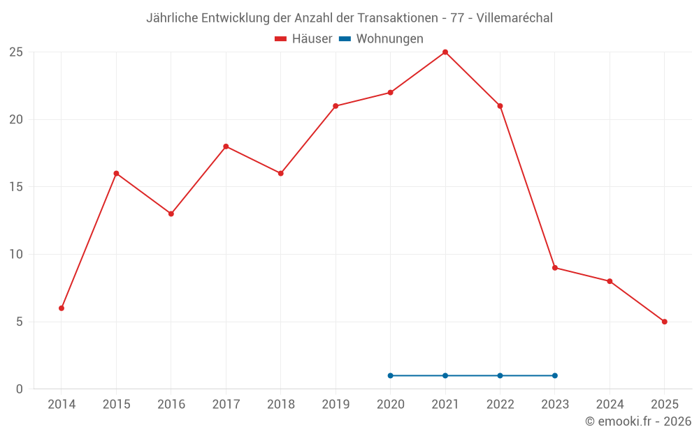 Der Durchschnittspreis auf den 19 Hausgeschäften der letzten 24 Monate in der Gemeinde Villemaréchal betrug 2 245 € pro Quadratmeter für einen mittleren Immobilienwert von 186 000 €. Über diesen Zeitraum hinweg lagen 60% der Transaktionen zwischen 1 579 und 2 994 € pro Quadratmeter (vom 2. bis zum 8. Dezil).
