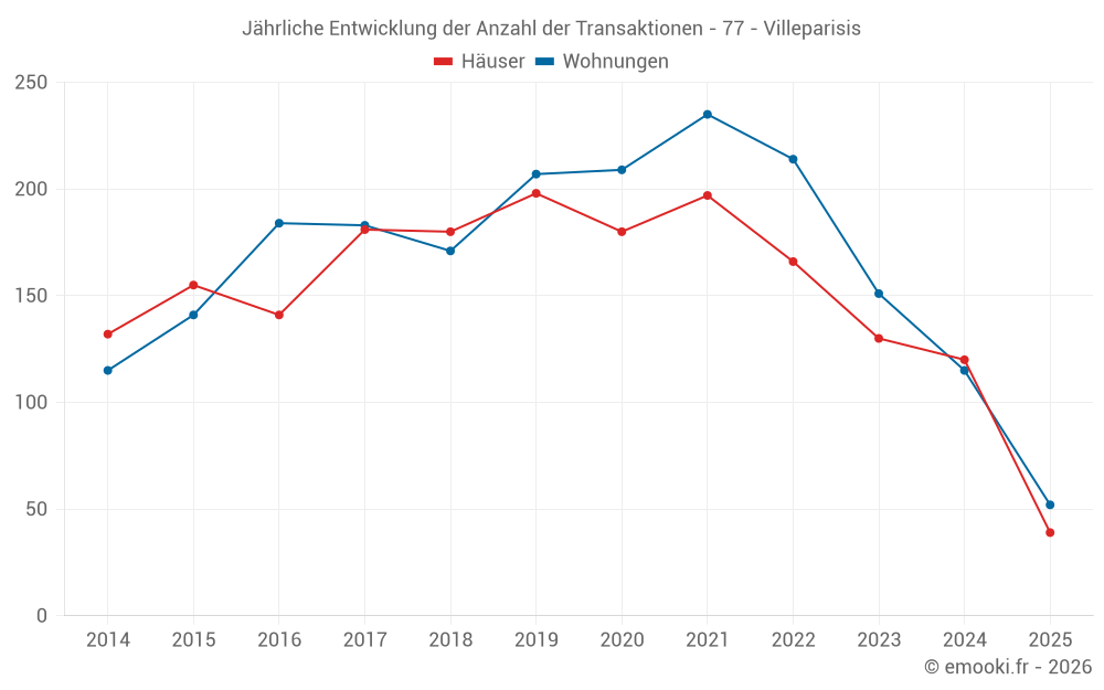 Der Durchschnittspreis auf den 39 Hausgeschäften der letzten 6 Monate in der Gemeinde Villeparisis betrug 3 533 € pro Quadratmeter für einen mittleren Immobilienwert von 280 000 €. Über diesen Zeitraum hinweg lagen 60% der Transaktionen zwischen 3 072 und 4 073 € pro Quadratmeter (vom 2. bis zum 8. Dezil).
