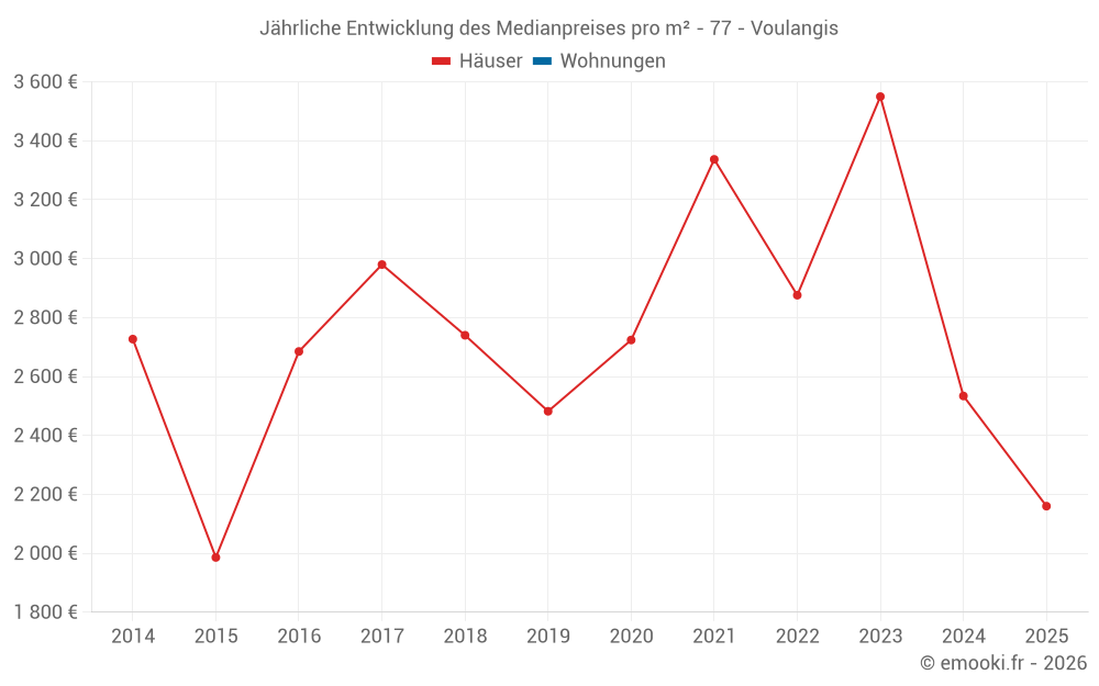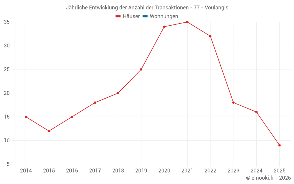Der Durchschnittspreis auf den 20 Hausgeschäften der letzten 12 Monate in der Gemeinde Voulangis betrug 2 375 € pro Quadratmeter für einen mittleren Immobilienwert von 282 585 €. Über diesen Zeitraum hinweg lagen 60% der Transaktionen zwischen 1 112 und 3 313 € pro Quadratmeter (vom 2. bis zum 8. Dezil).