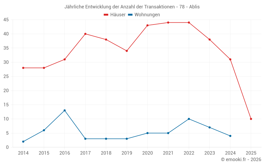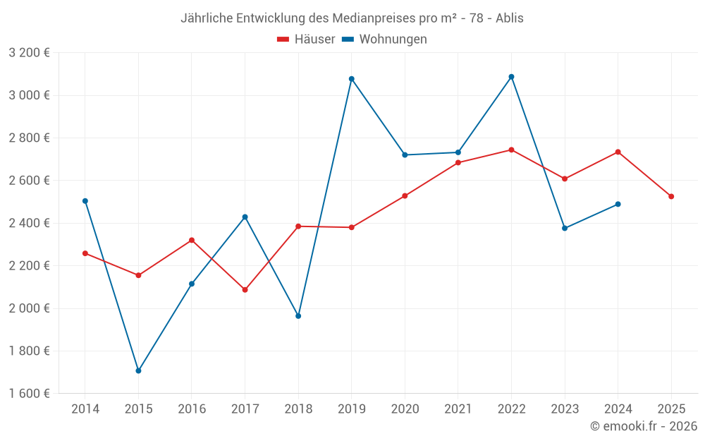 Der Durchschnittspreis auf den 21 Hausgeschäften der letzten 12 Monate in der Gemeinde Ablis betrug 2 882 € pro Quadratmeter für einen mittleren Immobilienwert von 286 200 €. Über diesen Zeitraum hinweg lagen 60% der Transaktionen zwischen 2 492 und 3 205 € pro Quadratmeter (vom 2. bis zum 8. Dezil).