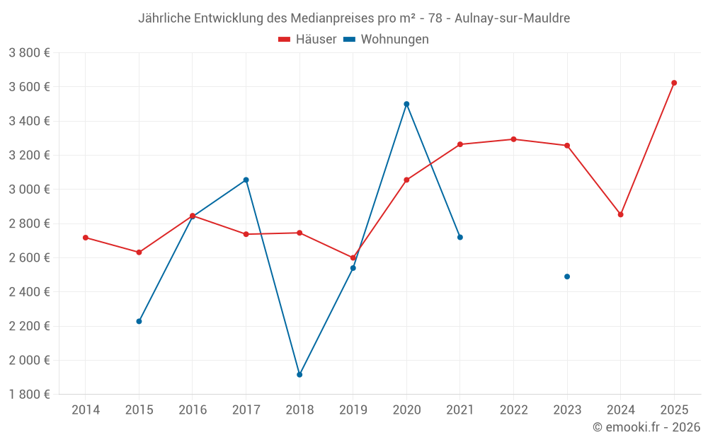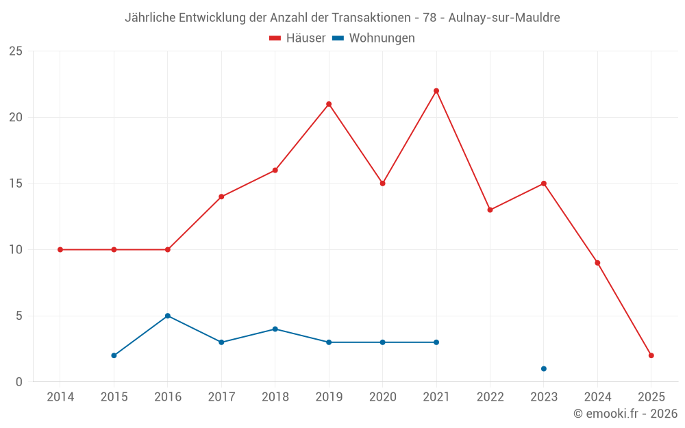 Der Durchschnittspreis auf den 20 Hausgeschäften der letzten 24 Monate in der Gemeinde Aulnay-sur-Mauldre betrug 3 010 € pro Quadratmeter für einen mittleren Immobilienwert von 282 500 €. Über diesen Zeitraum hinweg lagen 60% der Transaktionen zwischen 2 310 und 3 769 € pro Quadratmeter (vom 2. bis zum 8. Dezil).