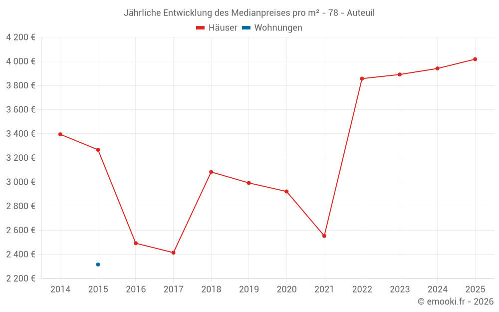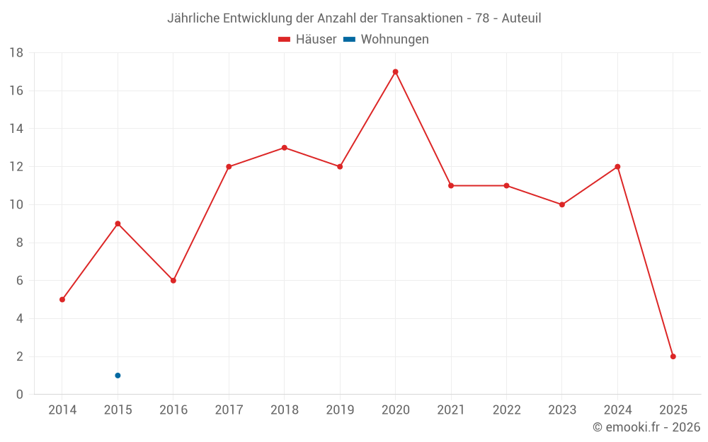 Der Durchschnittspreis auf den 22 Hausgeschäften der letzten 24 Monate in der Gemeinde Auteuil betrug 3 891 € pro Quadratmeter für einen mittleren Immobilienwert von 446 550 €. Über diesen Zeitraum hinweg lagen 60% der Transaktionen zwischen 3 347 und 4 332 € pro Quadratmeter (vom 2. bis zum 8. Dezil).