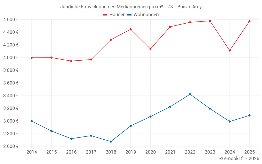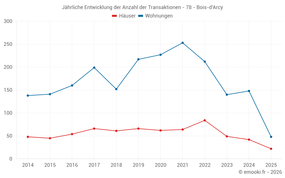 Der Durchschnittspreis auf den 22 Hausgeschäften der letzten 6 Monate in der Gemeinde Bois-d'Arcy betrug 4 574 € pro Quadratmeter für einen mittleren Immobilienwert von 406 845 €. Über diesen Zeitraum hinweg lagen 60% der Transaktionen zwischen 3 640 und 5 493 € pro Quadratmeter (vom 2. bis zum 8. Dezil).
