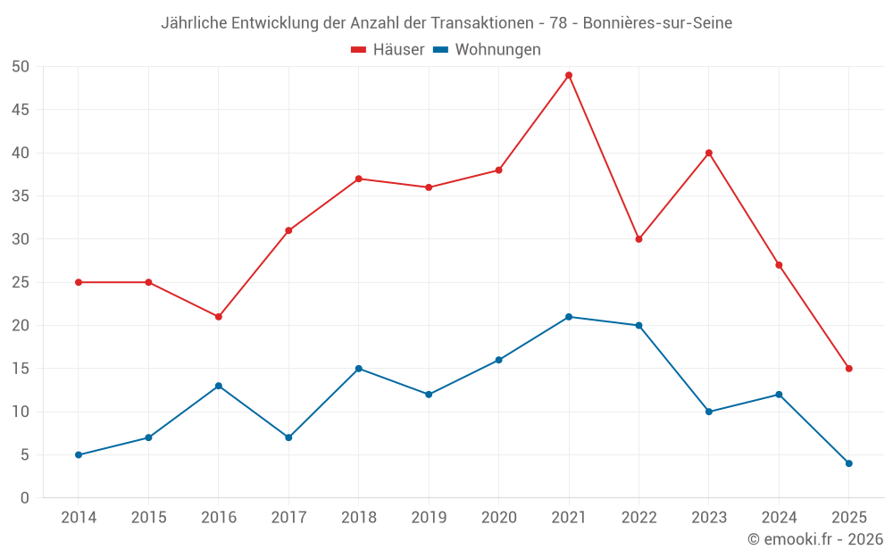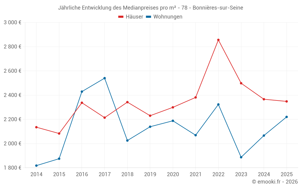 Der Durchschnittspreis auf den 27 Hausgeschäften der letzten 12 Monate in der Gemeinde Bonnières-sur-Seine betrug 2 348 € pro Quadratmeter für einen mittleren Immobilienwert von 220 000 €. Über diesen Zeitraum hinweg lagen 60% der Transaktionen zwischen 2 077 und 2 733 € pro Quadratmeter (vom 2. bis zum 8. Dezil).