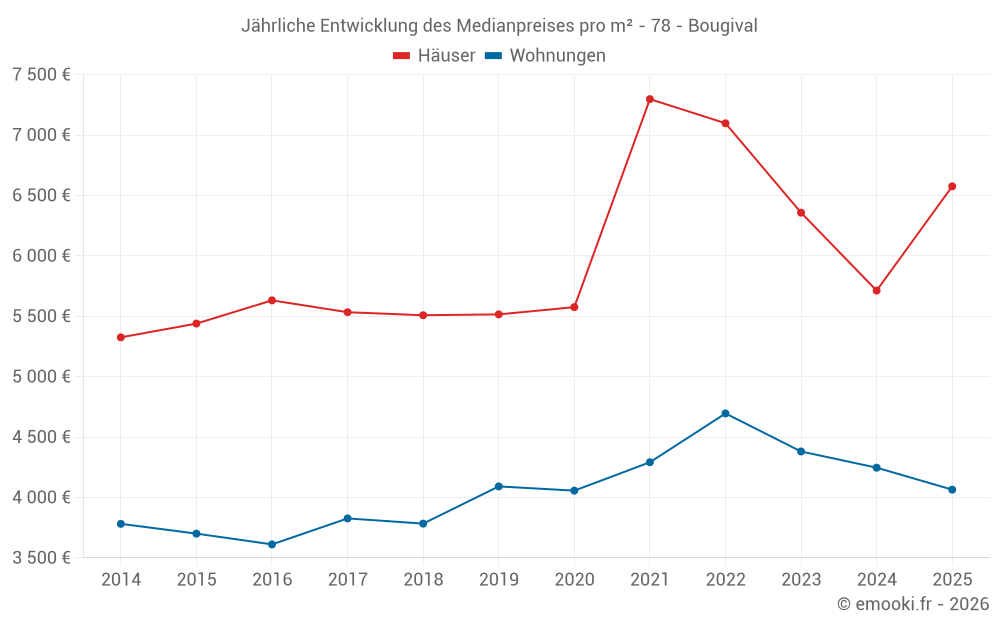 Der Durchschnittspreis auf den 24 Wohnungstransaktionen der letzten 6 Monate in der Gemeinde Bougival betrug 4 064 € pro Quadratmeter für einen mittleren Immobilienwert von 294 850 €. Über diesen Zeitraum hinweg lagen 60% der Transaktionen zwischen 3 652 und 4 915 € pro Quadratmeter (vom 2. bis zum 8. Dezil).