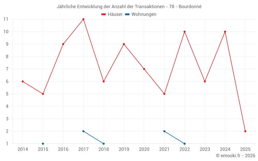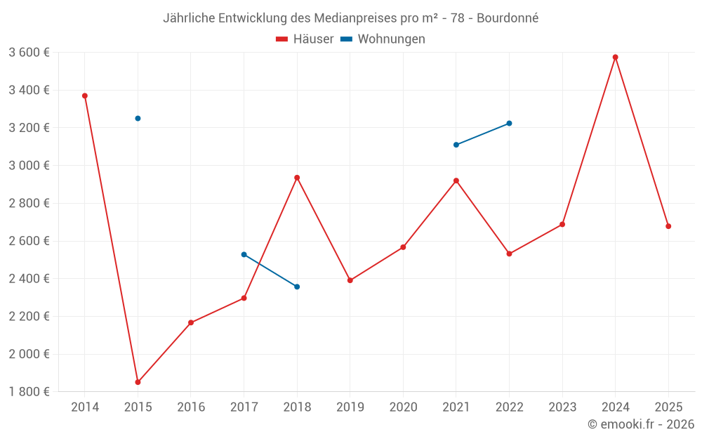 Der Durchschnittspreis auf den 17 Hausgeschäften der letzten 24 Monate in der Gemeinde Bourdonné betrug 2 973 € pro Quadratmeter für einen mittleren Immobilienwert von 420 100 €. Über diesen Zeitraum hinweg lagen 60% der Transaktionen zwischen 2 127 und 4 194 € pro Quadratmeter (vom 2. bis zum 8. Dezil).