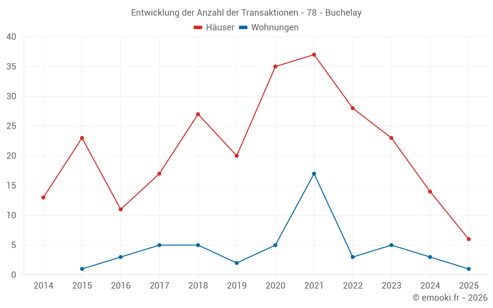 Der Durchschnittspreis auf den 33 Hausgeschäften der letzten 24 Monate in der Gemeinde Buchelay betrug 2 980 € pro Quadratmeter für einen mittleren Immobilienwert von 281 300 €. Über diesen Zeitraum hinweg lagen 60% der Transaktionen zwischen 2 326 und 3 357 € pro Quadratmeter (vom 2. bis zum 8. Dezil).