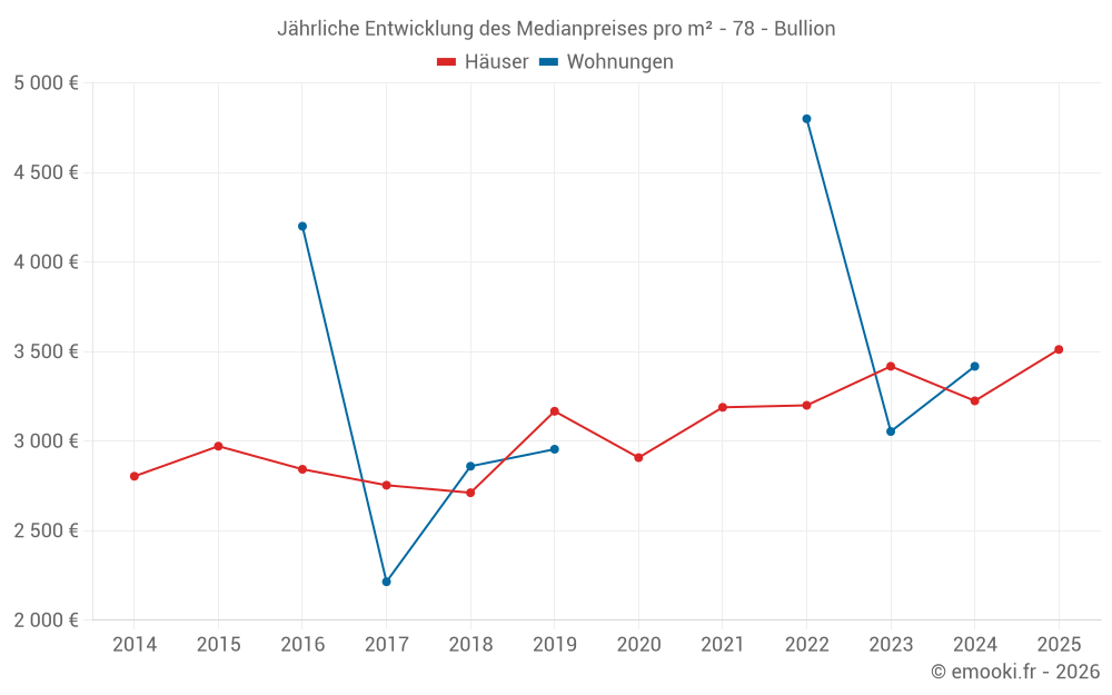 Der Durchschnittspreis auf den 29 Hausgeschäften der letzten 24 Monate in der Gemeinde Bullion betrug 3 221 € pro Quadratmeter für einen mittleren Immobilienwert von 320 000 €. Über diesen Zeitraum hinweg lagen 60% der Transaktionen zwischen 2 281 und 4 448 € pro Quadratmeter (vom 2. bis zum 8. Dezil).