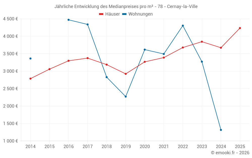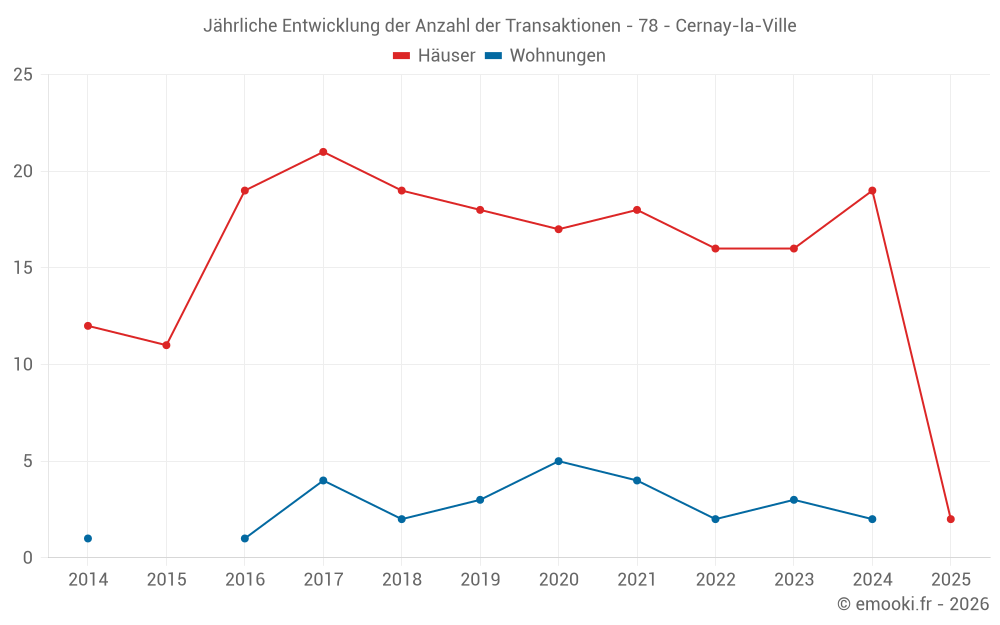 Der Durchschnittspreis auf den 28 Hausgeschäften der letzten 24 Monate in der Gemeinde Cernay-la-Ville betrug 3 686 € pro Quadratmeter für einen mittleren Immobilienwert von 324 000 €. Über diesen Zeitraum hinweg lagen 60% der Transaktionen zwischen 2 311 und 4 189 € pro Quadratmeter (vom 2. bis zum 8. Dezil).