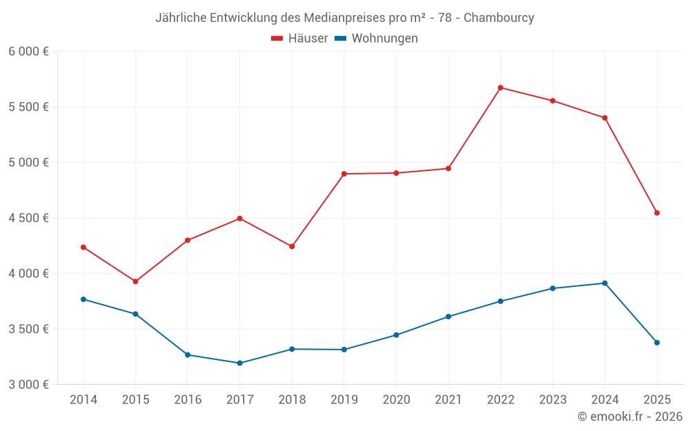 Der Durchschnittspreis auf den 20 Wohnungstransaktionen der letzten 6 Monate in der Gemeinde Chambourcy betrug 3 378 € pro Quadratmeter für einen mittleren Immobilienwert von 299 150 €. Über diesen Zeitraum hinweg lagen 60% der Transaktionen zwischen 3 115 und 3 666 € pro Quadratmeter (vom 2. bis zum 8. Dezil).