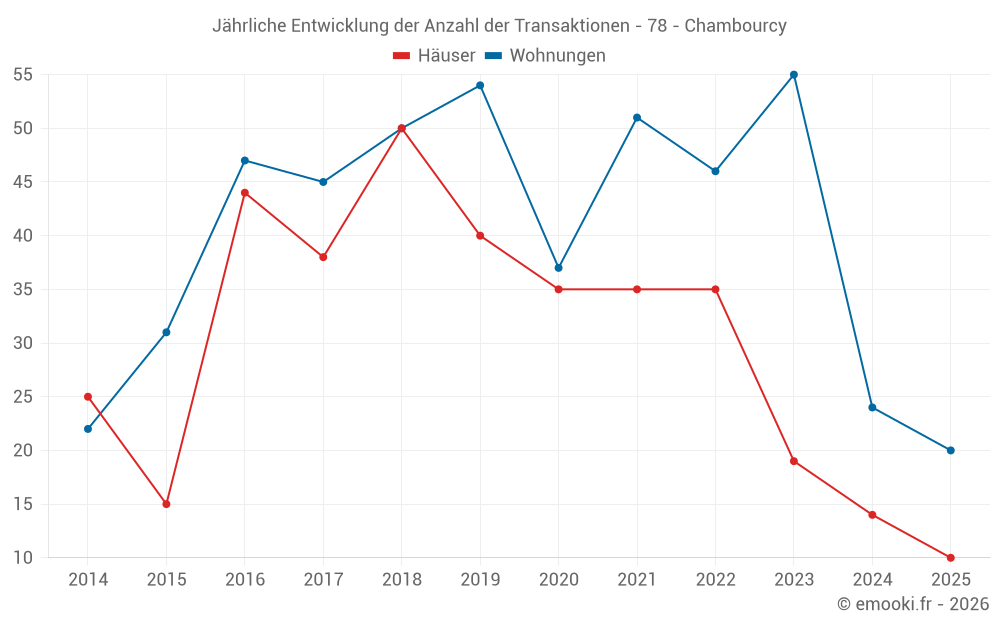 Der Durchschnittspreis auf den 20 Hausgeschäften der letzten 12 Monate in der Gemeinde Chambourcy betrug 4 788 € pro Quadratmeter für einen mittleren Immobilienwert von 683 800 €. Über diesen Zeitraum hinweg lagen 60% der Transaktionen zwischen 3 664 und 5 758 € pro Quadratmeter (vom 2. bis zum 8. Dezil).