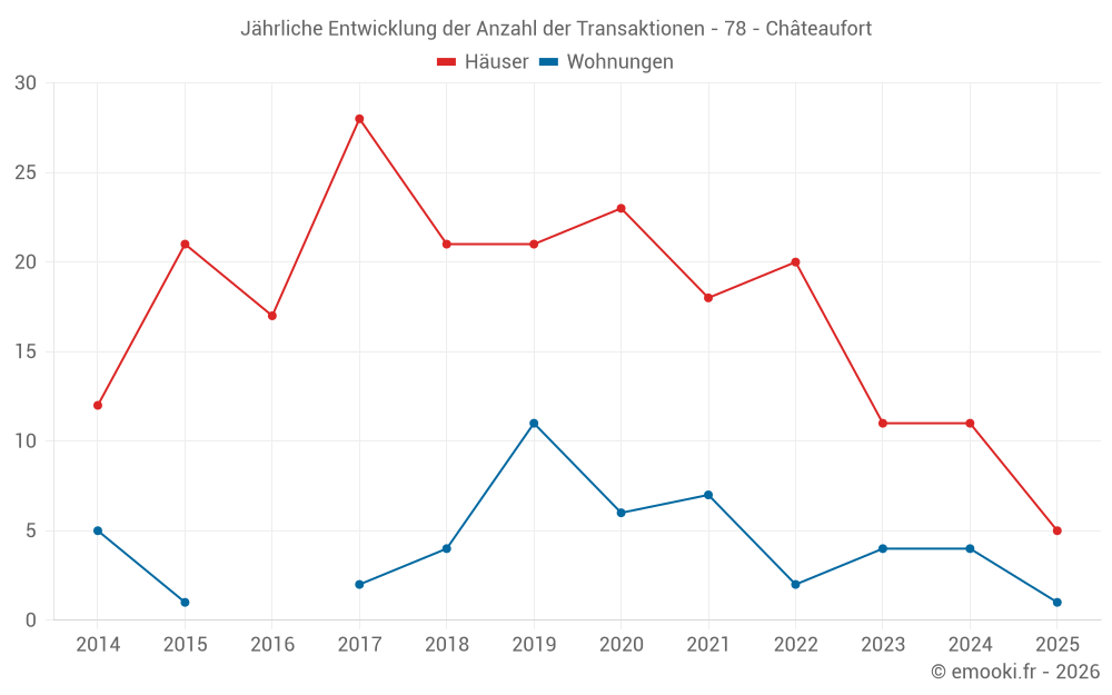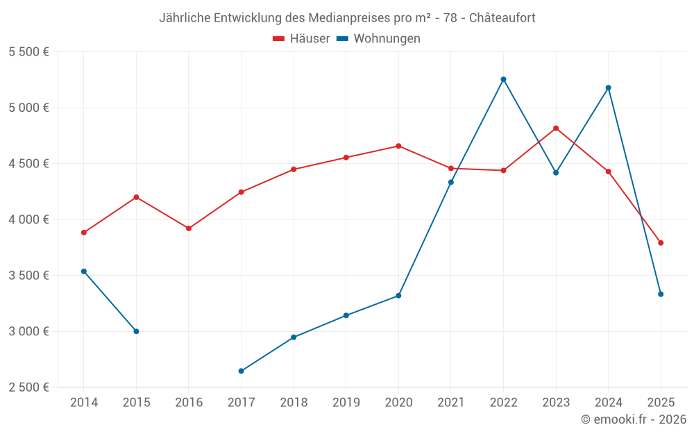 Der Durchschnittspreis auf den 23 Hausgeschäften der letzten 24 Monate in der Gemeinde Châteaufort betrug 4 638 € pro Quadratmeter für einen mittleren Immobilienwert von 552 550 €. Über diesen Zeitraum hinweg lagen 60% der Transaktionen zwischen 3 900 und 5 944 € pro Quadratmeter (vom 2. bis zum 8. Dezil).