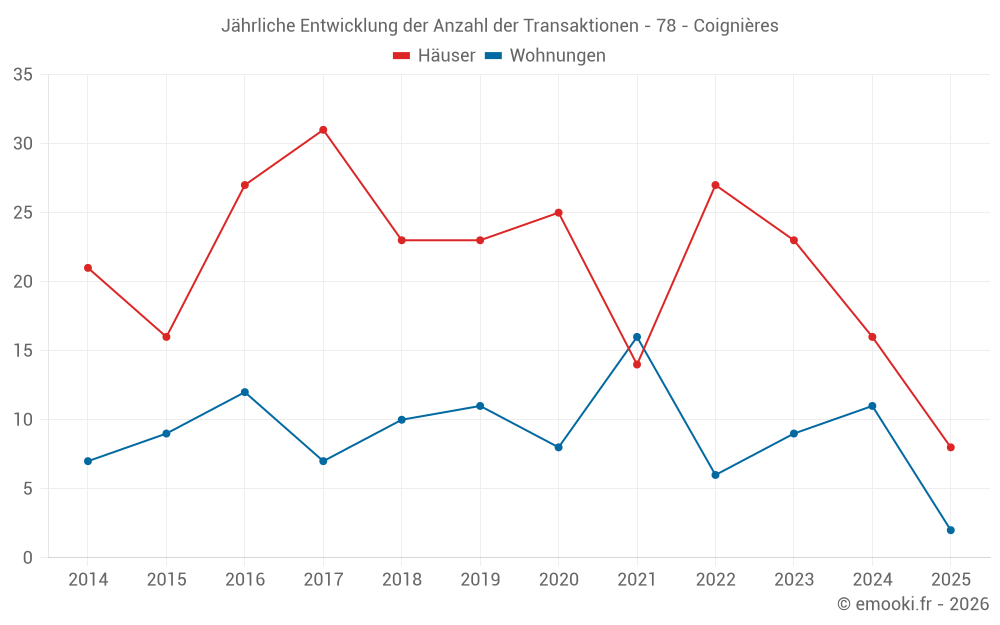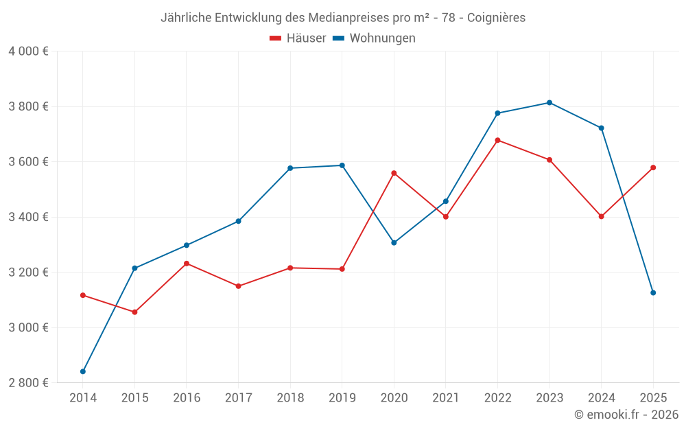 Der Durchschnittspreis auf den 16 Hausgeschäften der letzten 12 Monate in der Gemeinde Coignières betrug 3 579 € pro Quadratmeter für einen mittleren Immobilienwert von 320 000 €. Über diesen Zeitraum hinweg lagen 60% der Transaktionen zwischen 2 962 und 4 071 € pro Quadratmeter (vom 2. bis zum 8. Dezil).