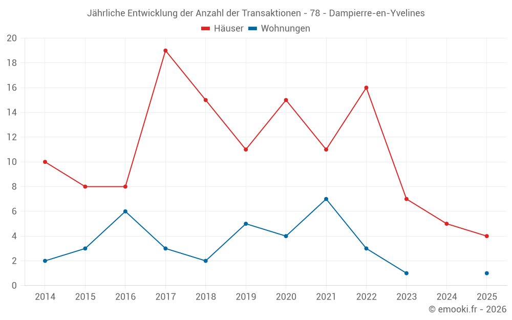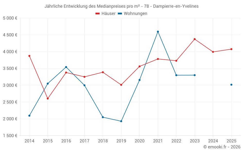 Der Preis pro m² von Häusern ist seit 2 Jahren um 6.8% gesunken, aber er ist in 10 Jahren um 57% gestiegen.