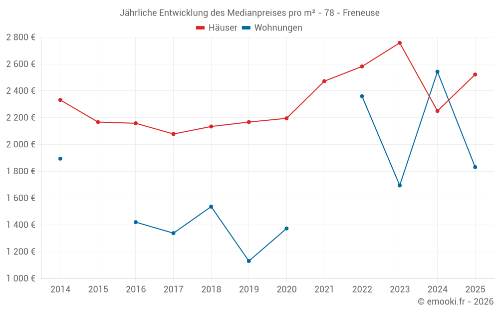Der Durchschnittspreis auf den 36 Hausgeschäften der letzten 12 Monate in der Gemeinde Freneuse betrug 2 284 € pro Quadratmeter für einen mittleren Immobilienwert von 189 000 €. Über diesen Zeitraum hinweg lagen 60% der Transaktionen zwischen 1 882 und 2 759 € pro Quadratmeter (vom 2. bis zum 8. Dezil).