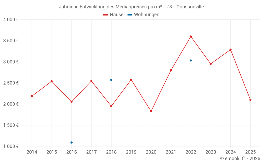 Der Durchschnittspreis auf den 18 Hausgeschäften der letzten 24 Monate in der Gemeinde Goussonville betrug 3 116 € pro Quadratmeter für einen mittleren Immobilienwert von 315 000 €. Über diesen Zeitraum hinweg lagen 60% der Transaktionen zwischen 2 200 und 3 682 € pro Quadratmeter (vom 2. bis zum 8. Dezil).