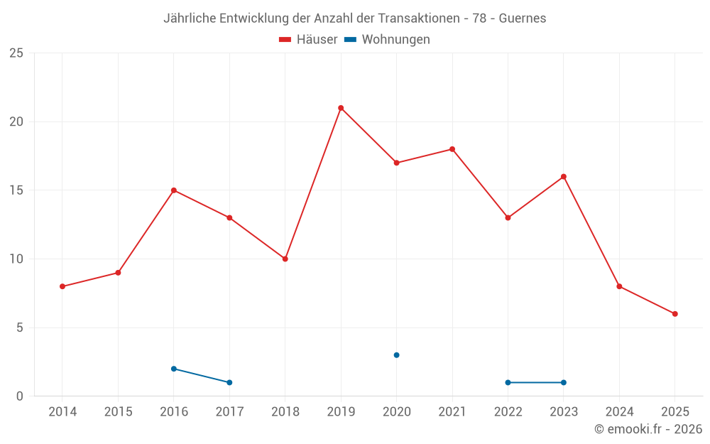 Der Durchschnittspreis auf den 23 Hausgeschäften der letzten 24 Monate in der Gemeinde Guernes betrug 2 500 € pro Quadratmeter für einen mittleren Immobilienwert von 220 000 €. Über diesen Zeitraum hinweg lagen 60% der Transaktionen zwischen 1 906 und 2 855 € pro Quadratmeter (vom 2. bis zum 8. Dezil).
