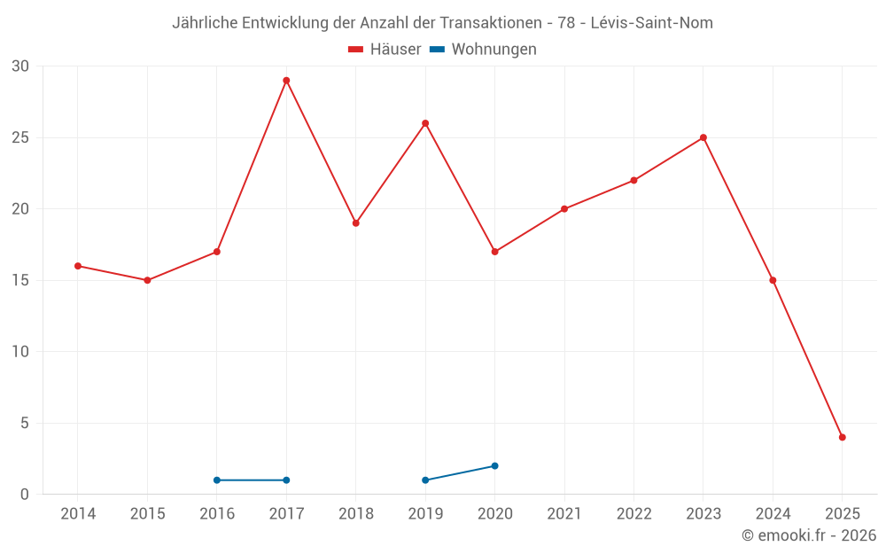 Der Durchschnittspreis auf den 31 Hausgeschäften der letzten 24 Monate in der Gemeinde Lévis-Saint-Nom betrug 3 710 € pro Quadratmeter für einen mittleren Immobilienwert von 400 000 €. Über diesen Zeitraum hinweg lagen 60% der Transaktionen zwischen 3 000 und 4 286 € pro Quadratmeter (vom 2. bis zum 8. Dezil).